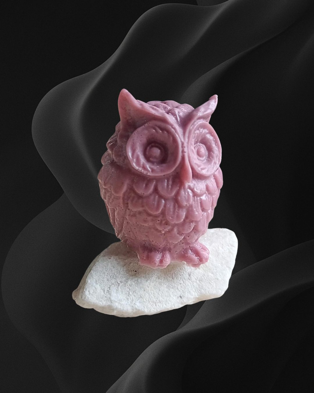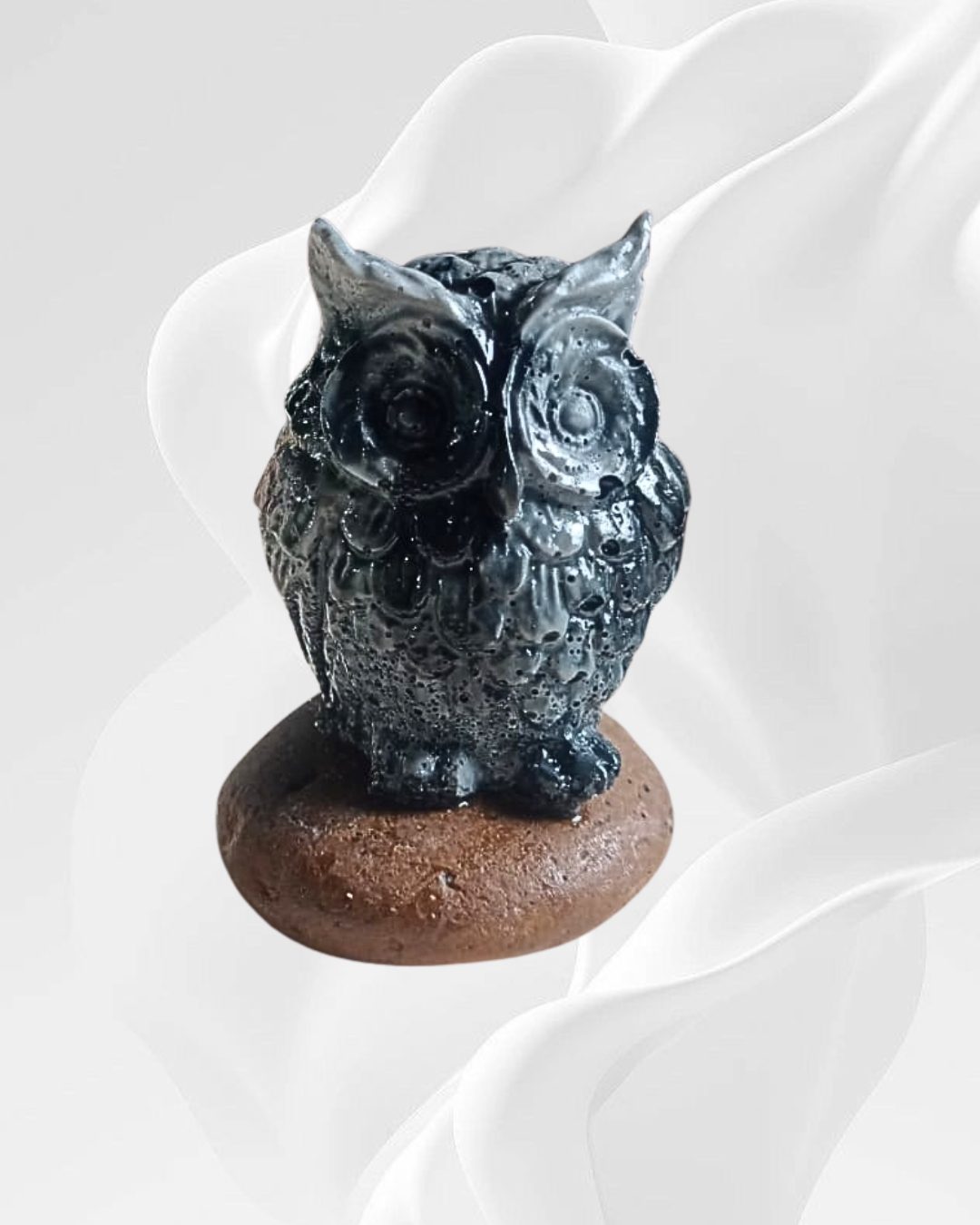 Figura de Búos de Medidas 8 x 4cm final  con base en piedras, mármol blanco, Turmalina negra, natural.