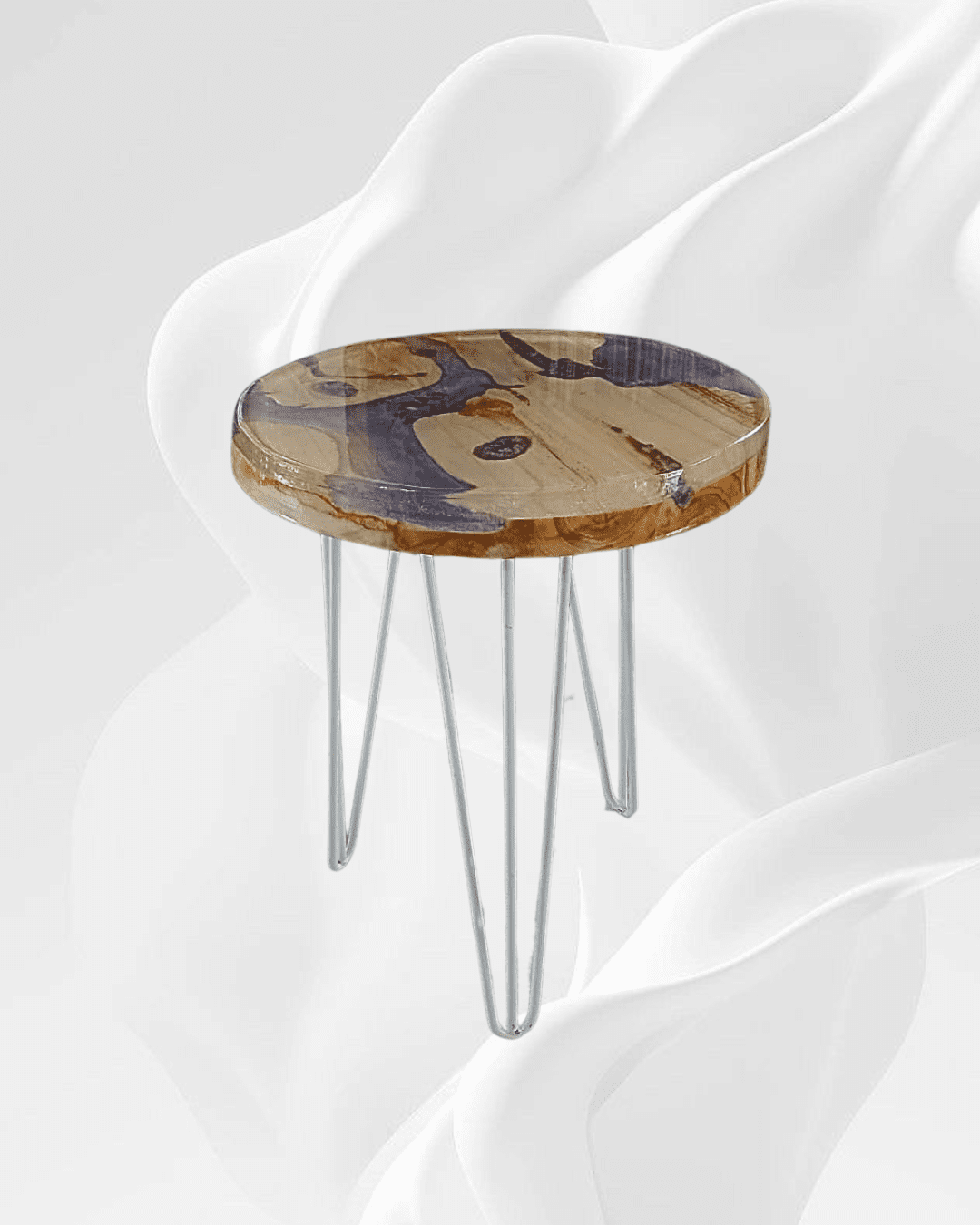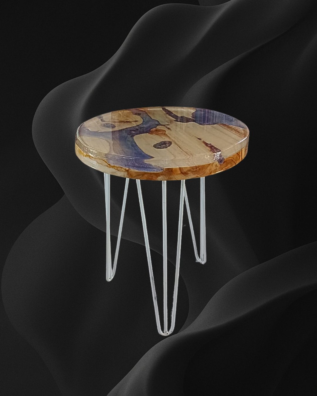 Madera tallada a mano con superficie de resina con incrustaciones de sodalita azul y pirita dorada.
